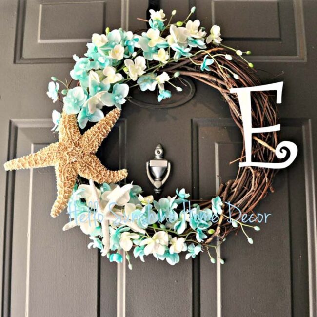 Handcrafted designs blend natural marine treasures with elegant floral accents, creating a welcoming entrance that celebrates summer's breezy spirit.