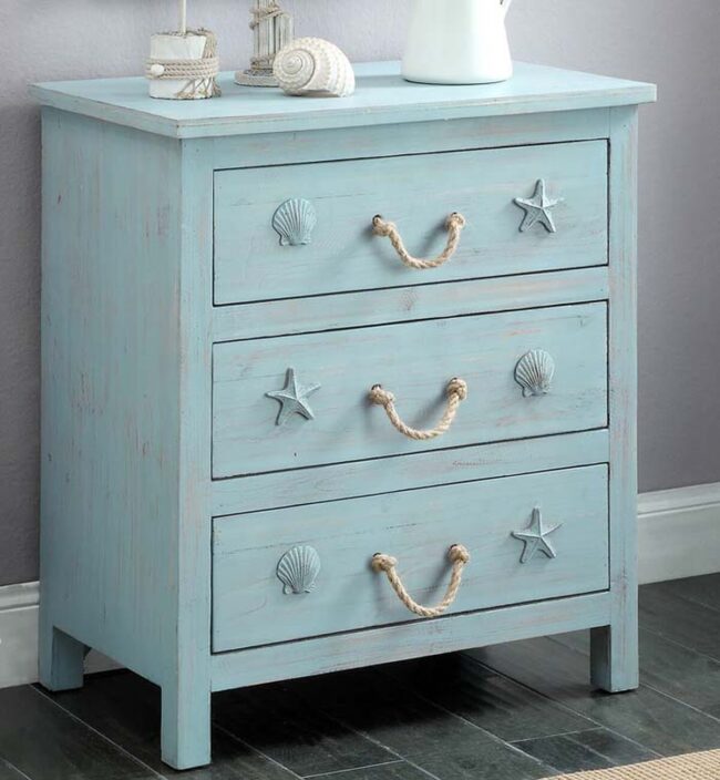 Nautical accents like seashell decorations or vintage glass bottles enhance the dresser's beachy aesthetic, transforming ordinary furniture into a conversation piece.