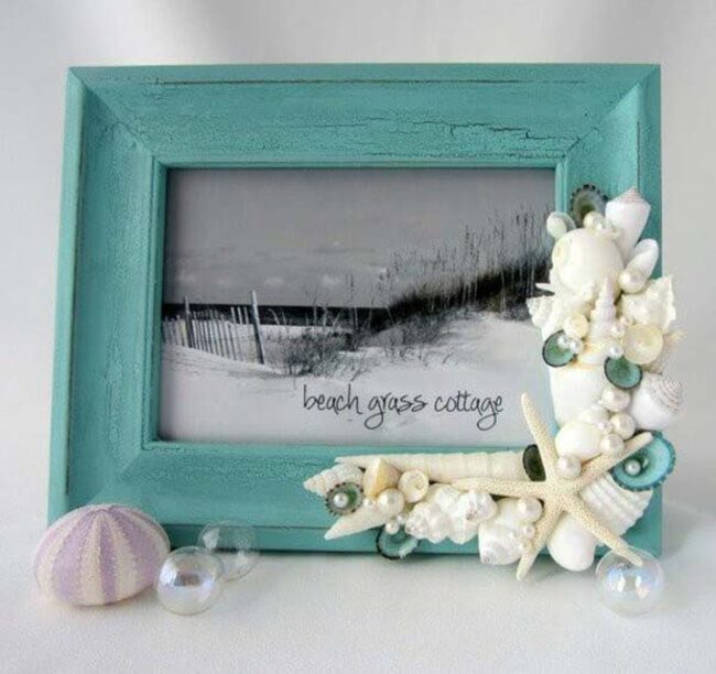 Wooden frames painted in soft blue or crisp white provide the perfect backdrop for delicate shells and iridescent pearls.