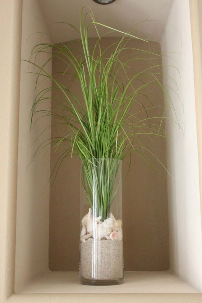 Glass containers filled with sand or small pebbles add depth and authenticity to the design.