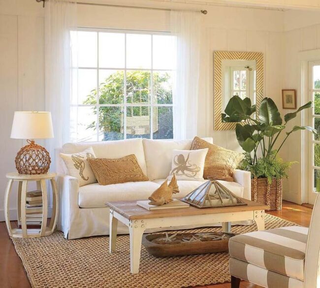 Natural materials like linen, cotton, and jute fabrics contribute to the relaxed, oceanic ambiance.