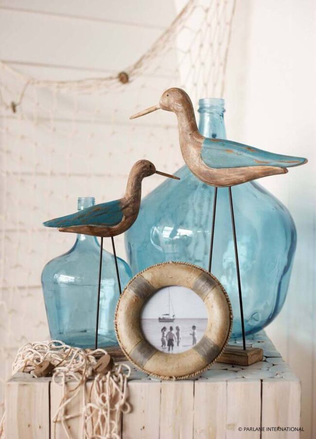 Seagull figurines positioned thoughtfully create visual interest and anchor the nautical theme with their classic seaside symbolism.