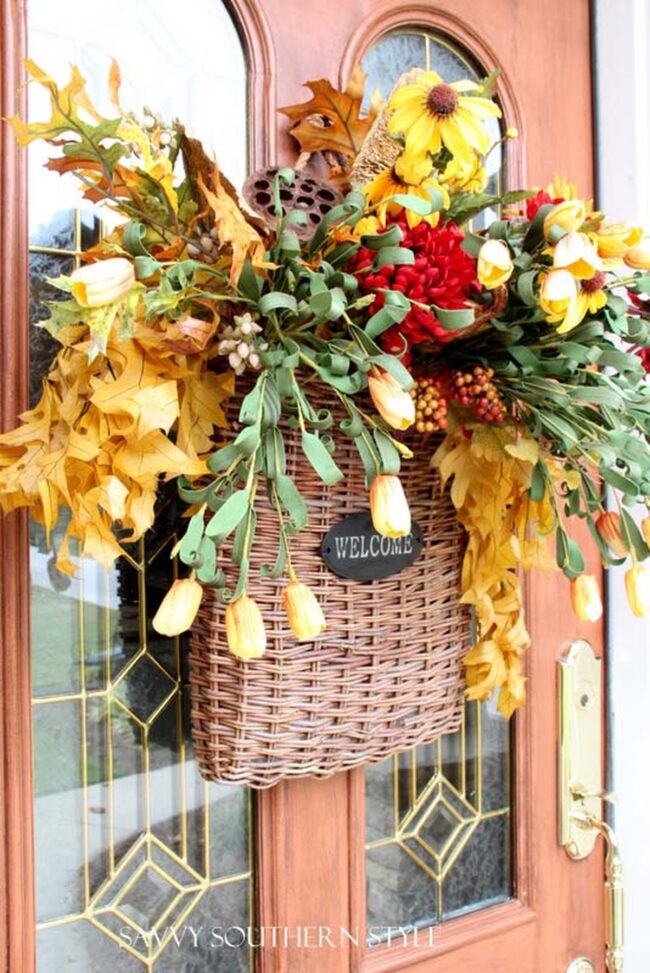 Door baskets burst with autumn's rich palette, creating an instant welcome for seasonal charm.
