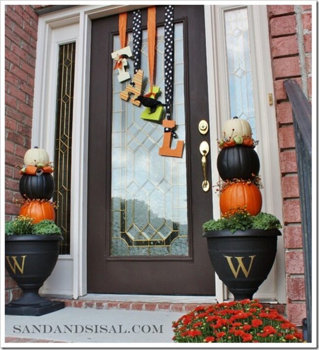 Pumpkin door displays radiate autumn charm, creating an inviting entrance that captures seasonal magic.
