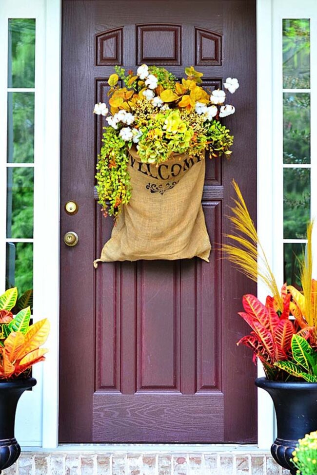 Rustic grain sack door decor captures autumn's essence with minimal effort and maximum charm.
