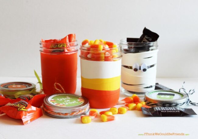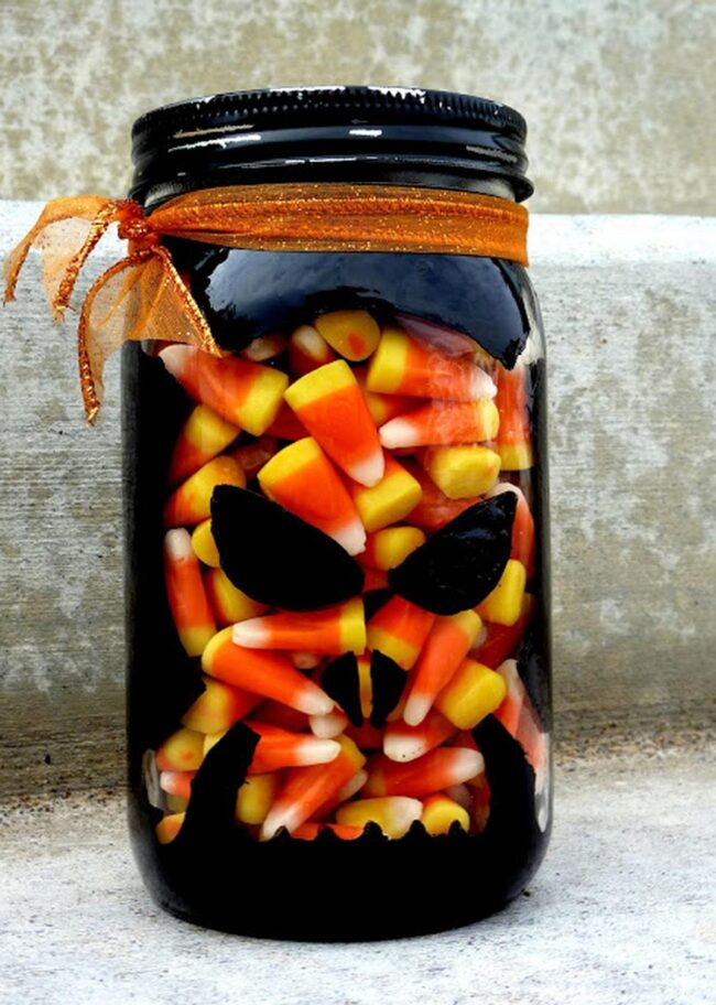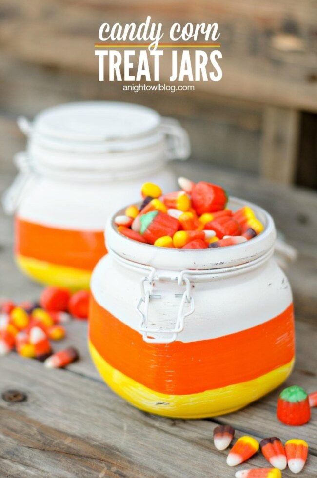 Sweet candy corn jars burst with Halloween magic, instantly drawing eyes with their charming seasonal spirit.