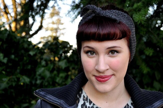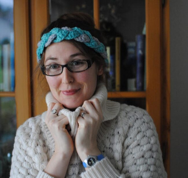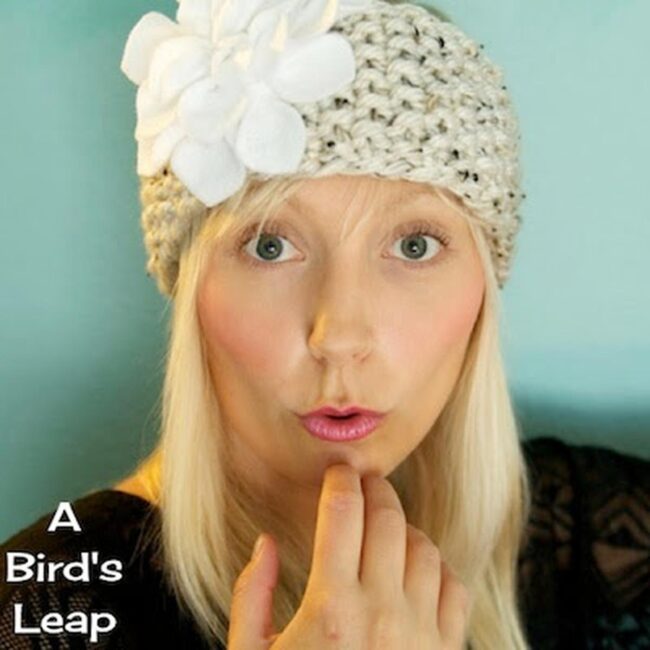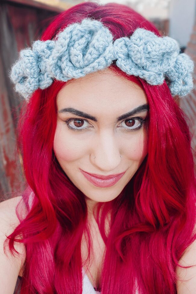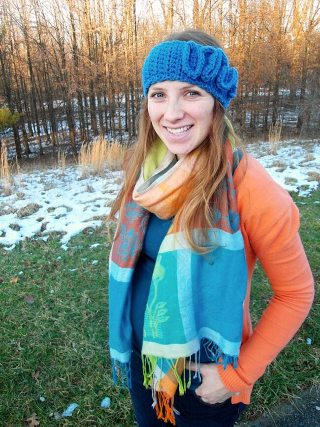 A charming knitted headband with delicate flower patterns adds whimsical softness to her look.
