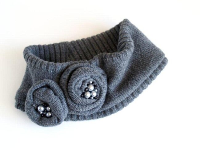 Soft gray neck warmers become instant conversation starters with delightful handcrafted details that make your winter outfit pop.