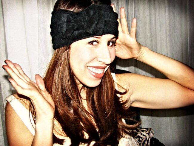 Her black ribbed jacket adds edgy sophistication to the outdoor scene, while a knitted headband introduces a personal, intimate touch.