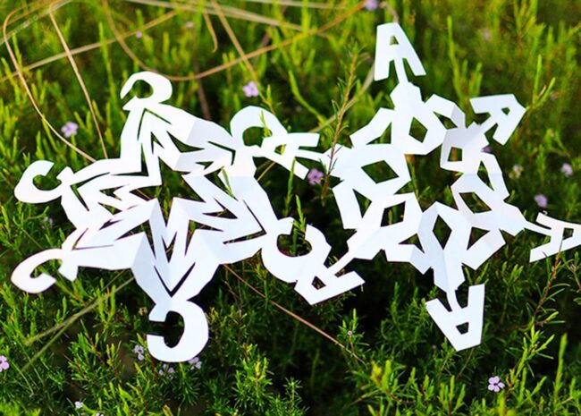 Delicate white cutouts showcase intricate designs nestled between green blades, revealing hidden letters and unexpected shapes that draw curious eyes.