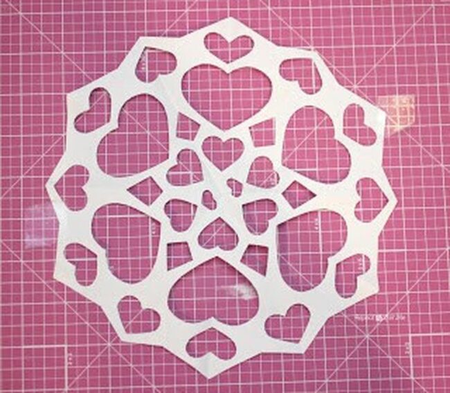 Delicate paper cutouts reveal an enchanting world of artistic precision, where heart-shaped designs dance across white surfaces with mesmerizing grace.