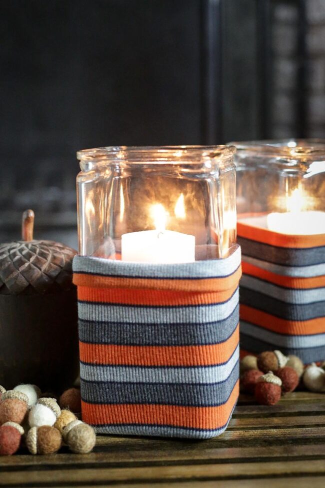 Magical glass holders spark joy with their seasonal charm, wrapping soft striped fabrics in delightful orange, gray, and blue tones that dance across wooden surfaces.