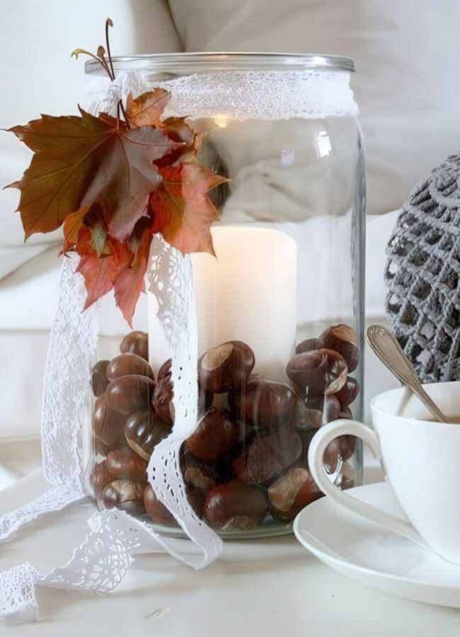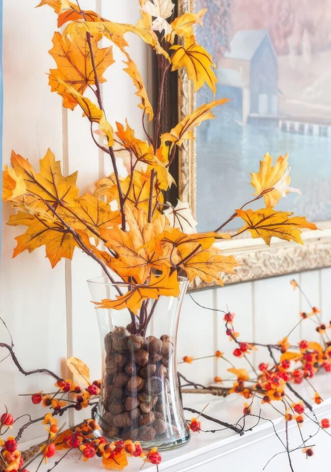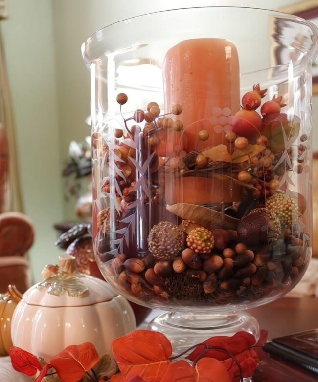 Glass containers already sitting in your cabinets can become seasonal accents when filled with autumn elements like acorns, colorful leaves, or mini pumpkins.