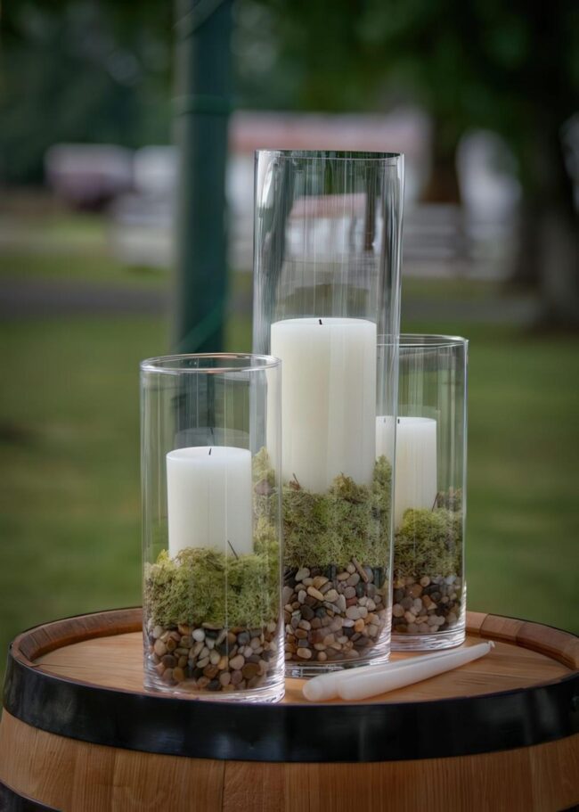Soft moss and smooth stones cradle white candles, creating an effortlessly charming scene that feels both intimate and stunning.