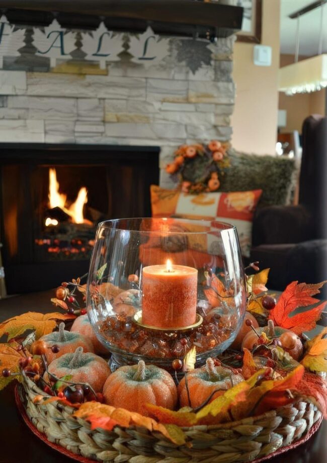 Imagine a clear glass holder cradling an orange candle, surrounded by scattered acorns and pinecones that whisper woodland secrets.