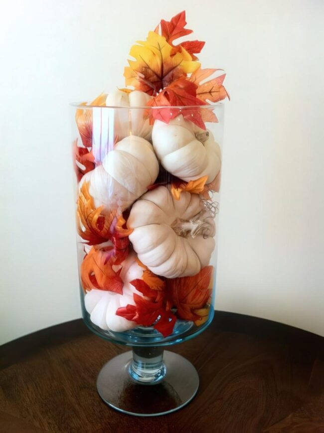 Glass vases become magical stages where delicate white pumpkins dance among fiery orange and crimson leaves, creating eye-catching displays that spark joy.