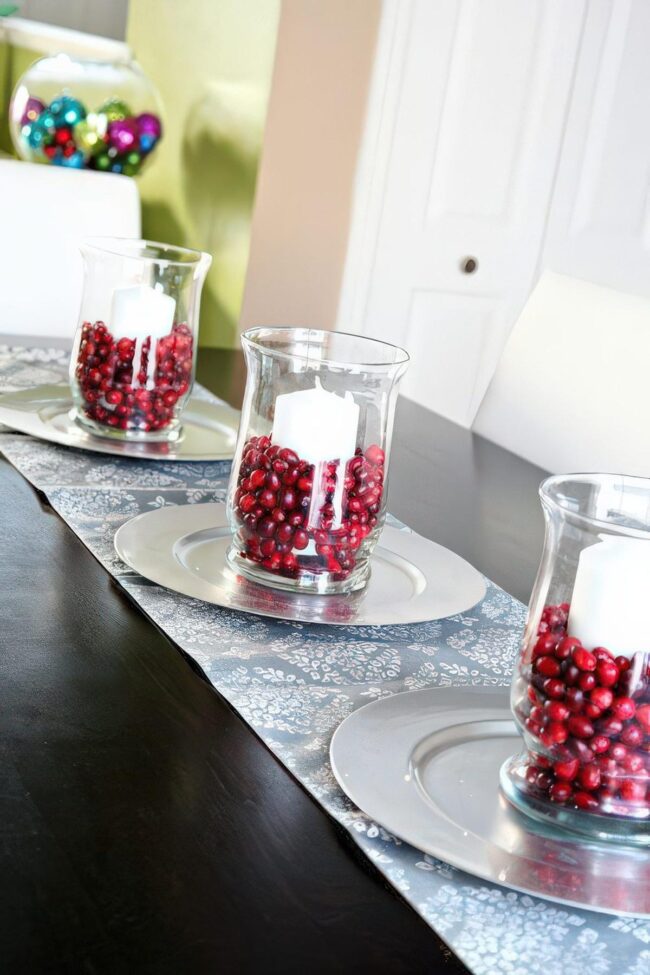 Silver plates sparkle beneath delicate glass candle holders sporting clusters of red berries, drawing eyes across the room with unexpected brilliance.