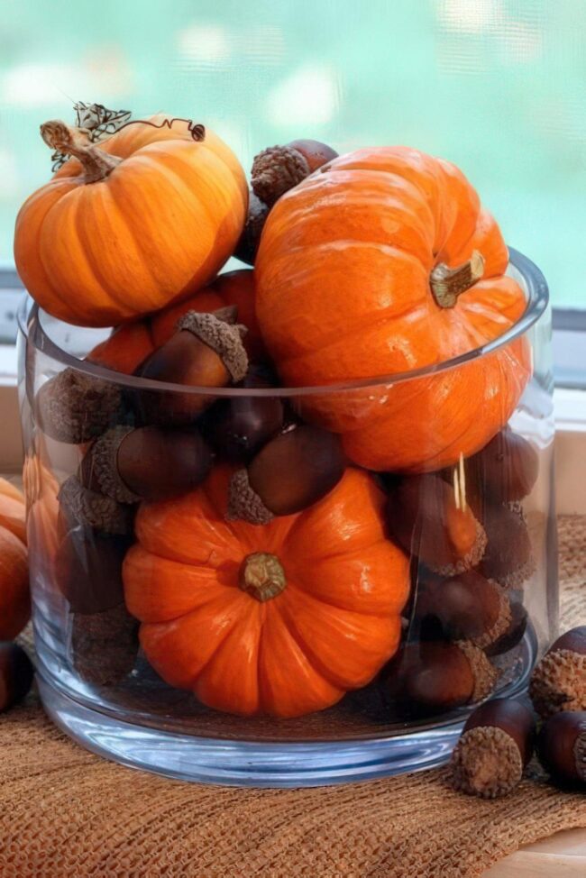 Smooth orange pumpkins nestled in clear glass bowls radiate incredible warmth, their glossy surfaces catching soft window light like precious jewels.