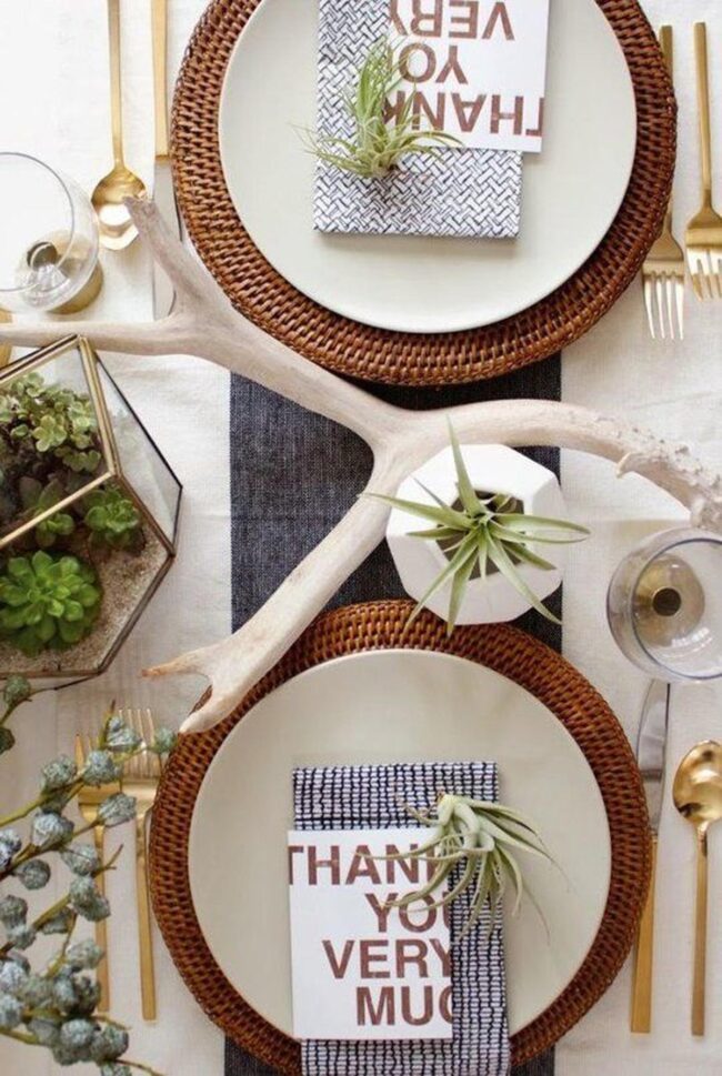 An eye-catching antler centerpiece stretches across the setting, delivering a surprising wilderness touch that keeps conversations flowing.