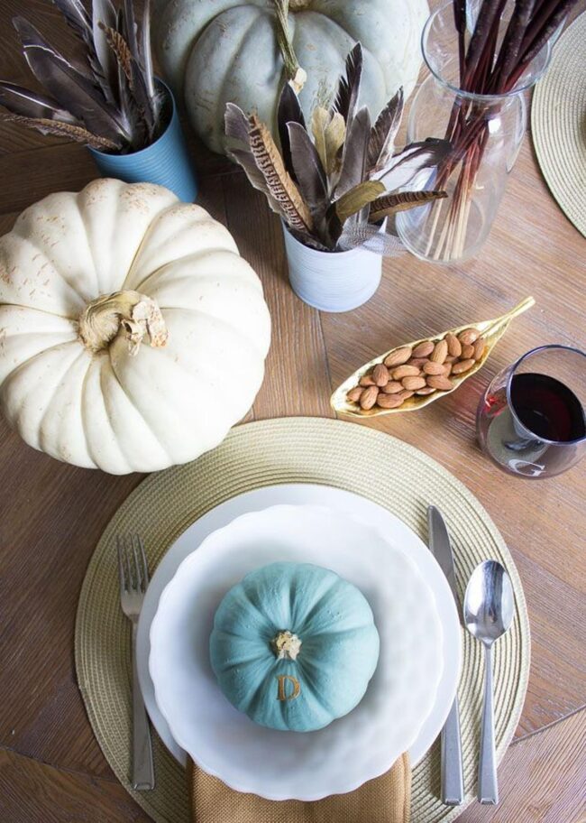 Fall dining becomes magical when soft greens, whites, and light golds cascade across your table, with pastel pumpkins adding unexpected natural beauty.