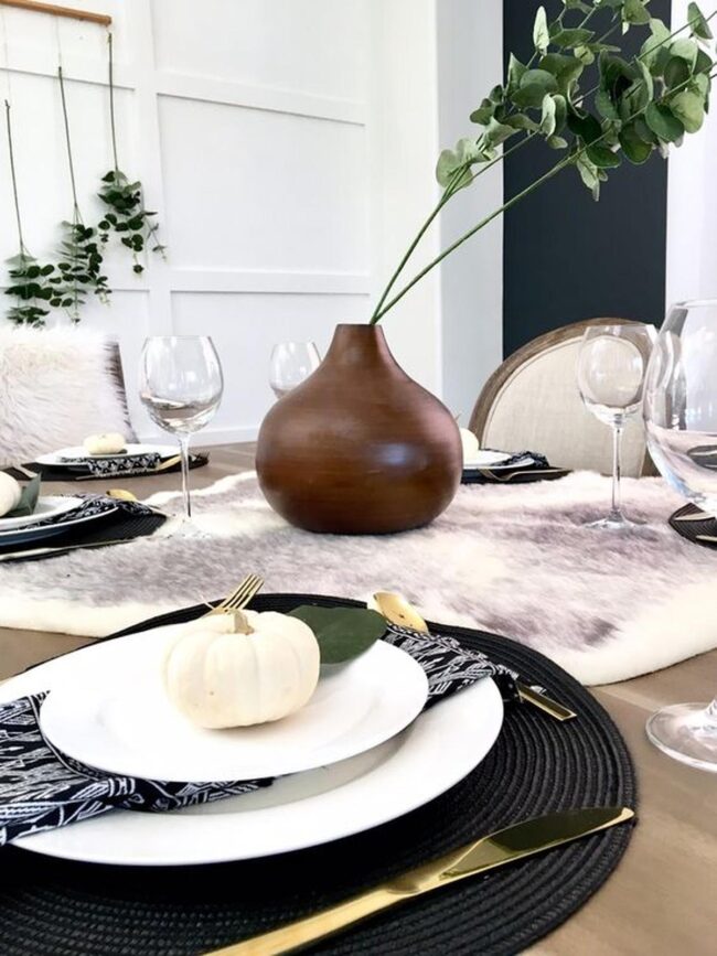 Petite white pumpkins perched atop dark bowls add unexpected charm without overwhelming the carefully curated design.