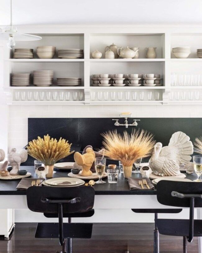 Delicate natural elements like dried wheat stalks and ceramic bird sculptures effortlessly invite outdoor beauty inside, softening the kitchen's strong lines with organic grace.