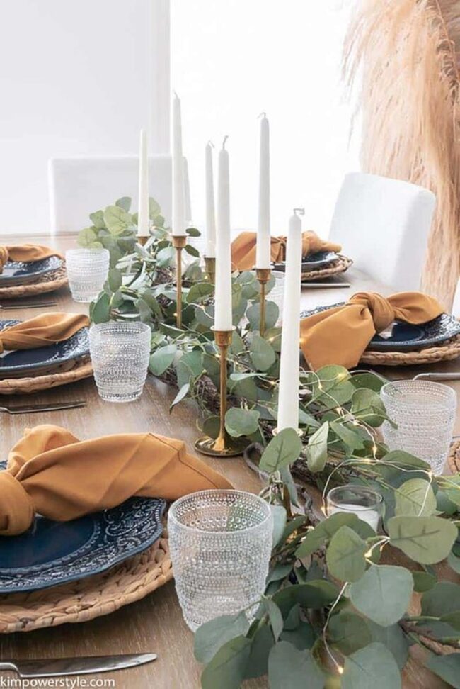 Nearby, leafy green branches weave through the centerpiece, bringing outdoor freshness directly to your dining experience.