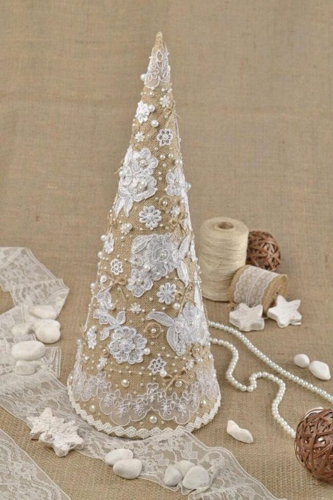 Soft natural fabric wraps around a charming cone, sparkling with delicate white lace flowers and tiny pearls that whisper understated beauty.