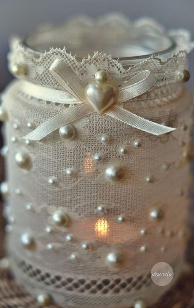 Candlelight magic comes alive when glass jars get wrapped in delicate lace, casting enchanting shadows across room surfaces with pearl beads sparkling softly.
