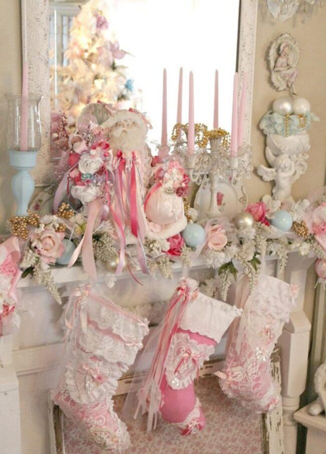 Lace-trimmed stockings dangle gracefully from mantles, while floral garlands dance between shimmering silver ornaments and delicate pastel accents that catch sunlight beautifully.