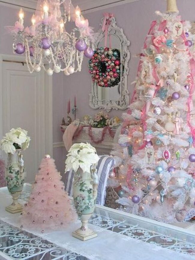 Pink and white whispers dance through this magical holiday space, weaving a spell of enchantment that instantly captivates your heart.