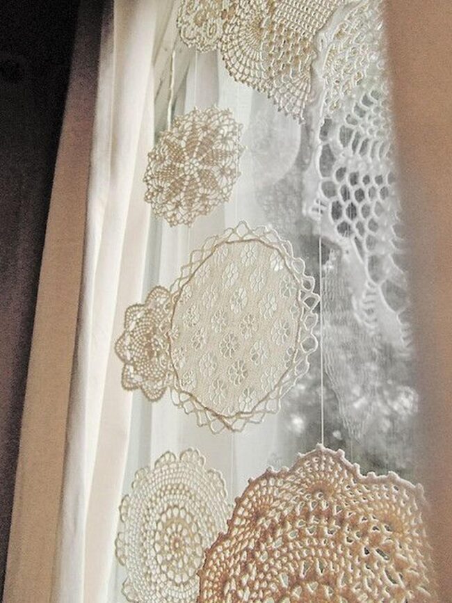 Handcrafted lace doilies convert ordinary windows into enchanting displays, where delicate circular patterns dance with sunlight and cast mesmerizing shadows across rooms.