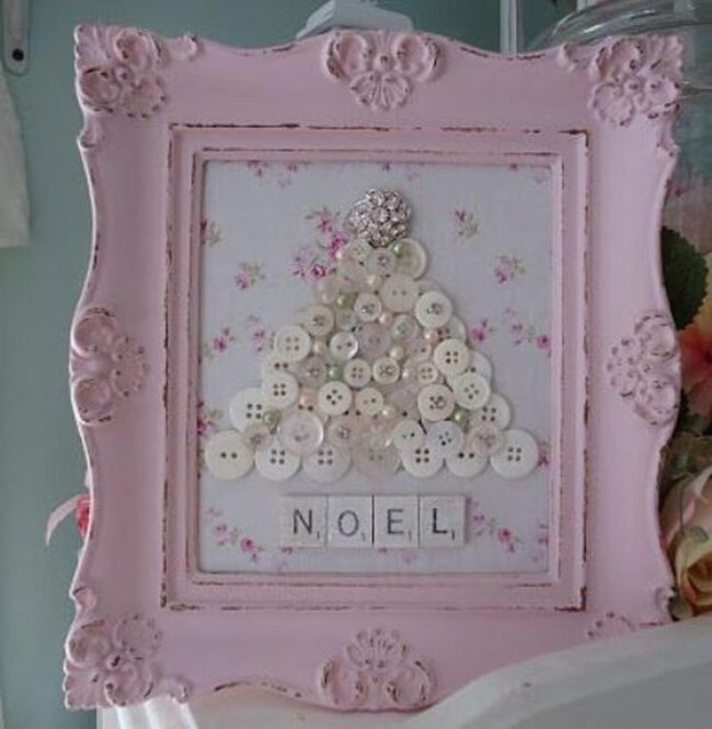 White buttons dance together on a soft pink canvas, creating a magical Christmas tree that describes holiday spirit with unexpected charm.
