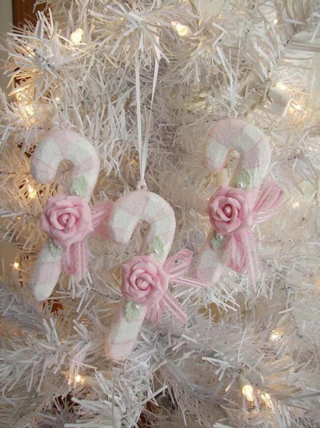 Sweet magic sparkles on a white Christmas tree where pink candy canes dance with delicate roses, creating an enchanting holiday scene.