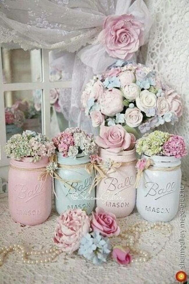 Soft pastel Mason jars burst with delicate cream and pale green blooms, capturing instant charm and visual magic for your living spaces.