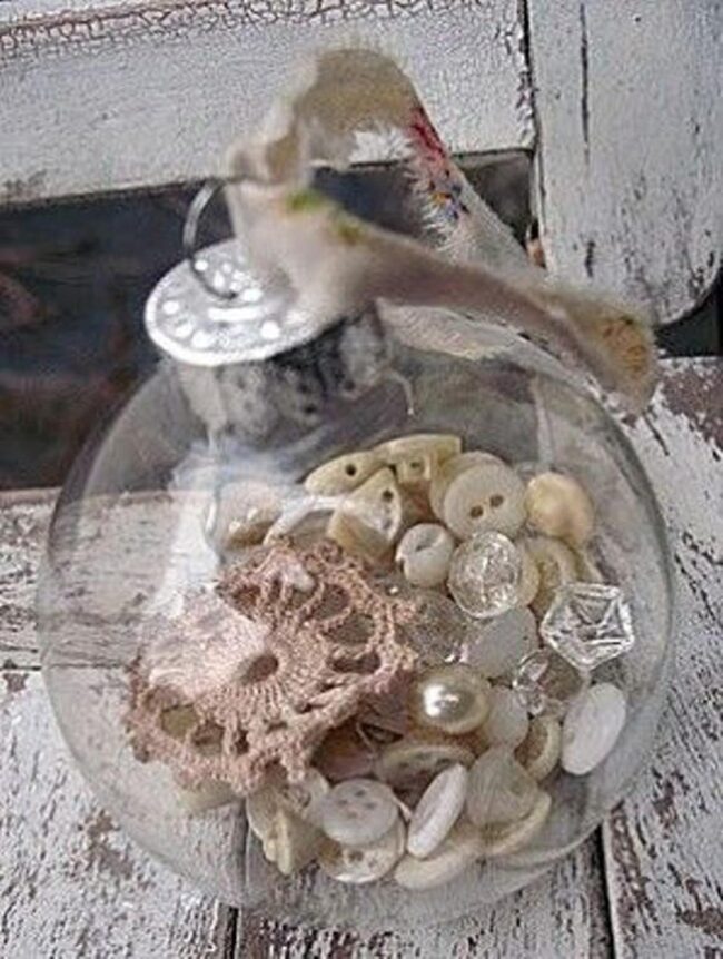 Memory-filled glass spheres become enchanting conversation pieces when you carefully arrange vintage buttons, delicate lace fragments, and colorful beads inside.