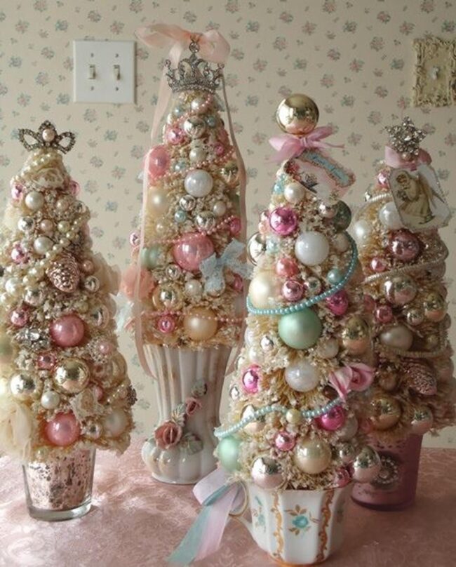 Miniature Christmas trees become storytellers when nestled on delicate white lace, each adorned with carefully chosen ornaments that whisper vintage charm.