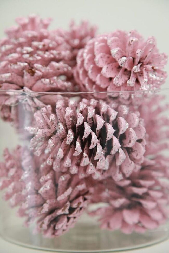 Sparkling pink pine cones tucked into a clear glass container instantly catch your eye with their unexpected charm.