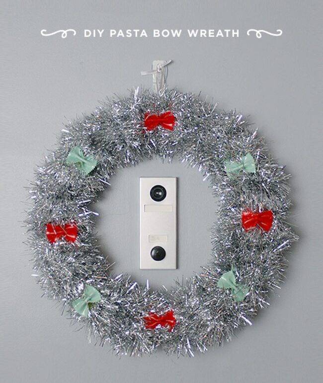 Holiday decorations burst with personality when you mix unexpected materials like shiny silver tinsel and colorful pasta bows.