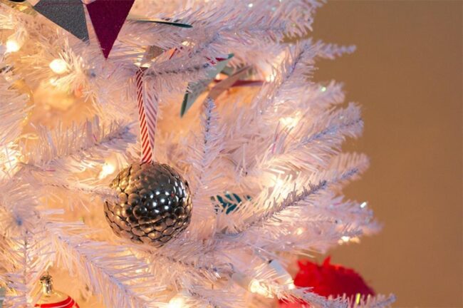 Delightful silver ornaments shimmer between evergreen needles, reflecting festive sparkles from every corner.