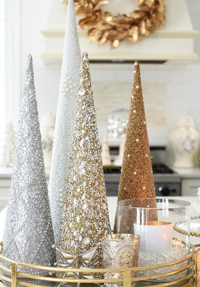 Sparkling holiday magic bursts from a golden tray, where four enchanting cone decorations dance with pearly brilliance and shimmering details.