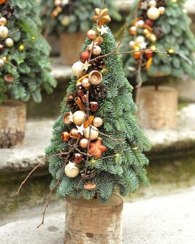 Nestled on a circular wooden platform, this mini holiday tree radiates woodland charm that instantly captivates your senses.