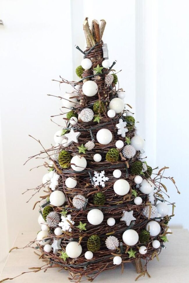 White ornaments of different shapes dance between the branches, creating magical visual interest that catches your eye instantly.