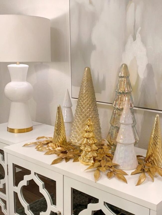 Gold-covered cone decorations sparkle like precious jewels against a white shelf, catching light and creating magic in your living space.