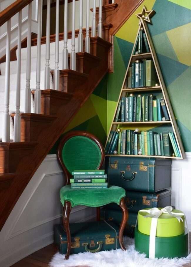 Wooden shelves shaped like a delightful Christmas tree showcase literary treasures, while a stunning emerald chair perches nearby with classic style and comfort.