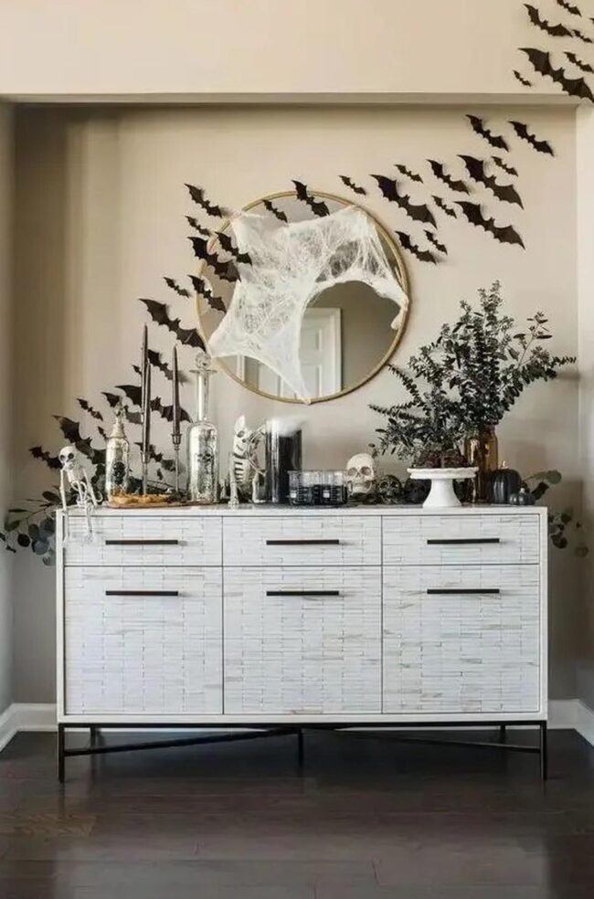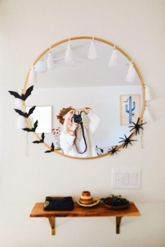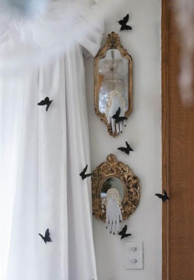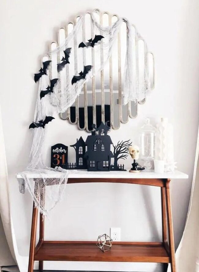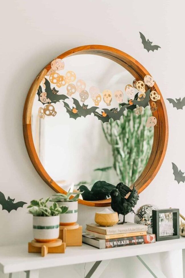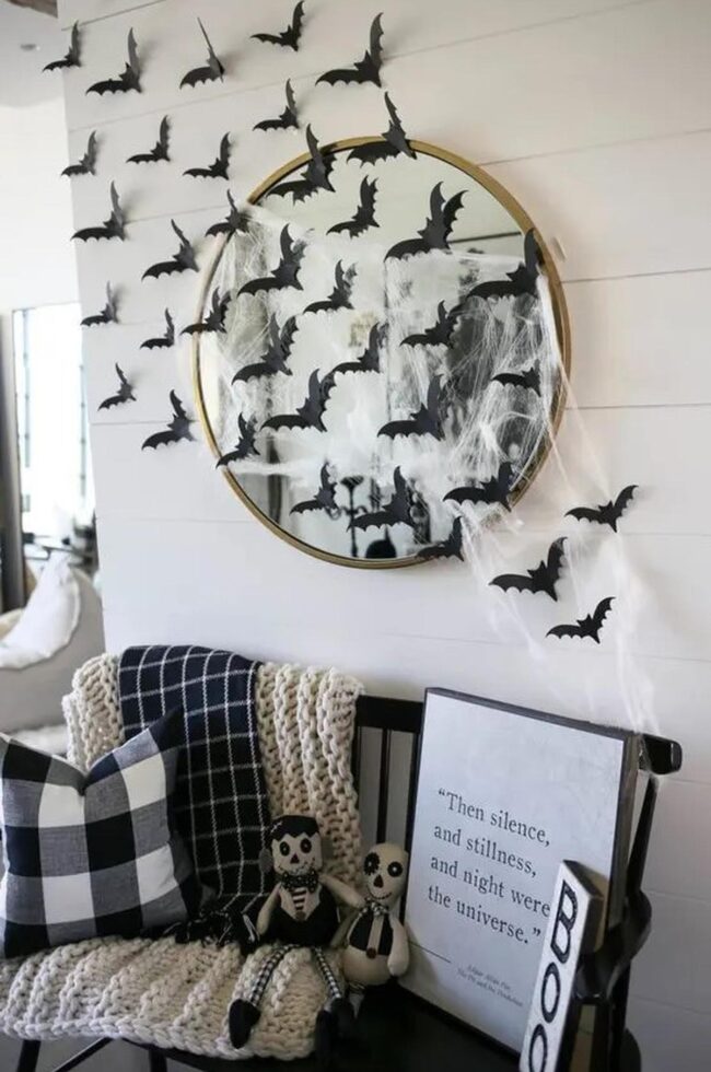 Halloween magic springs to life in this enchanting room corner where paper bats dance around a round mirror and delicate spider webs stretch across walls.