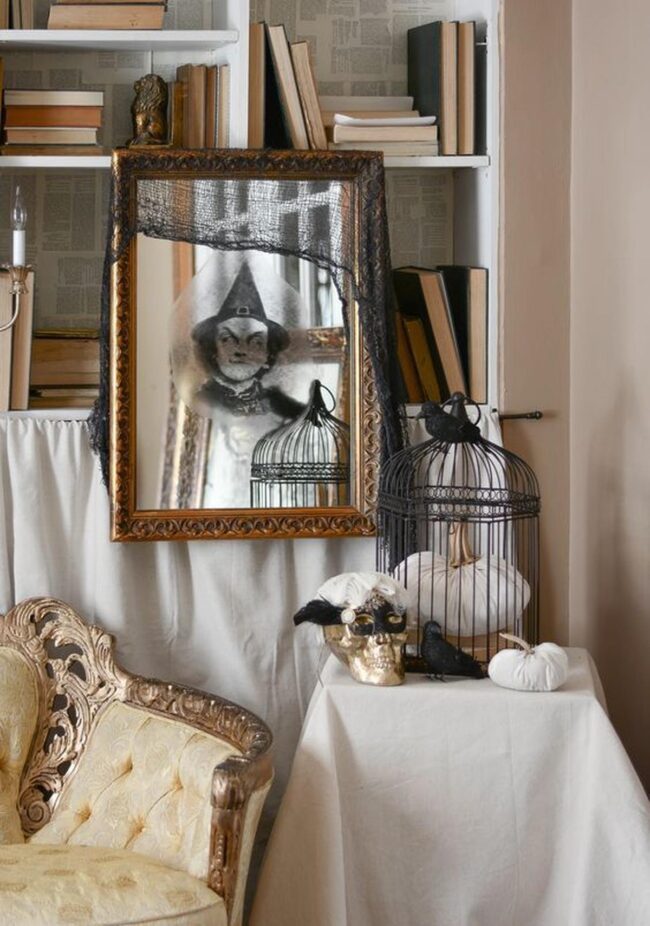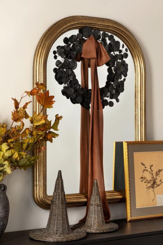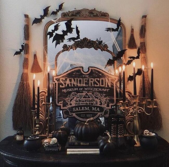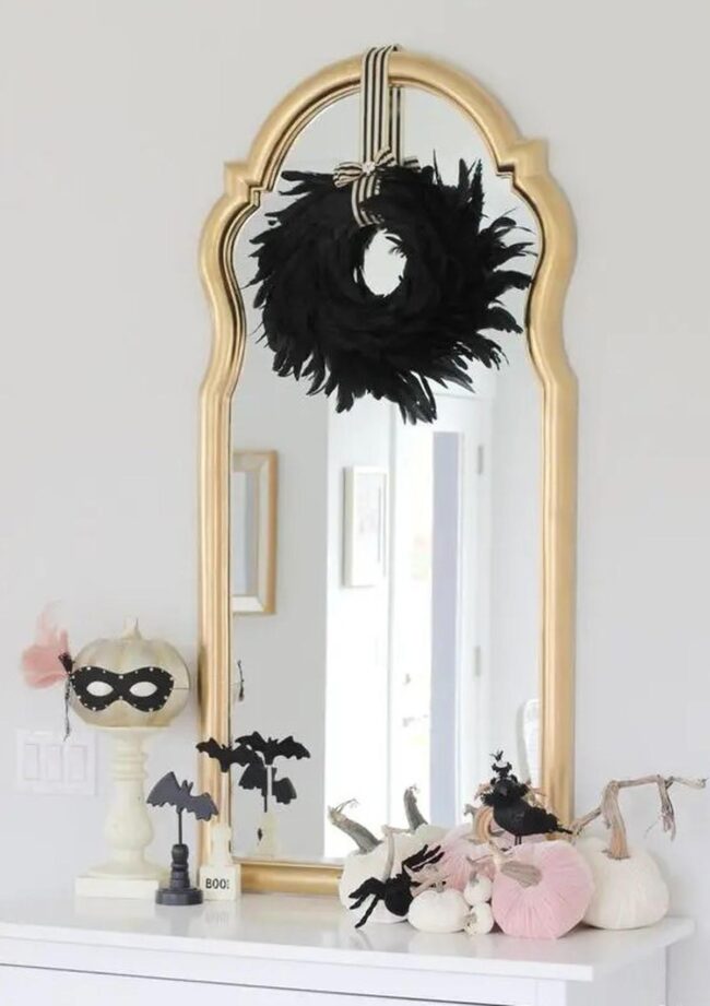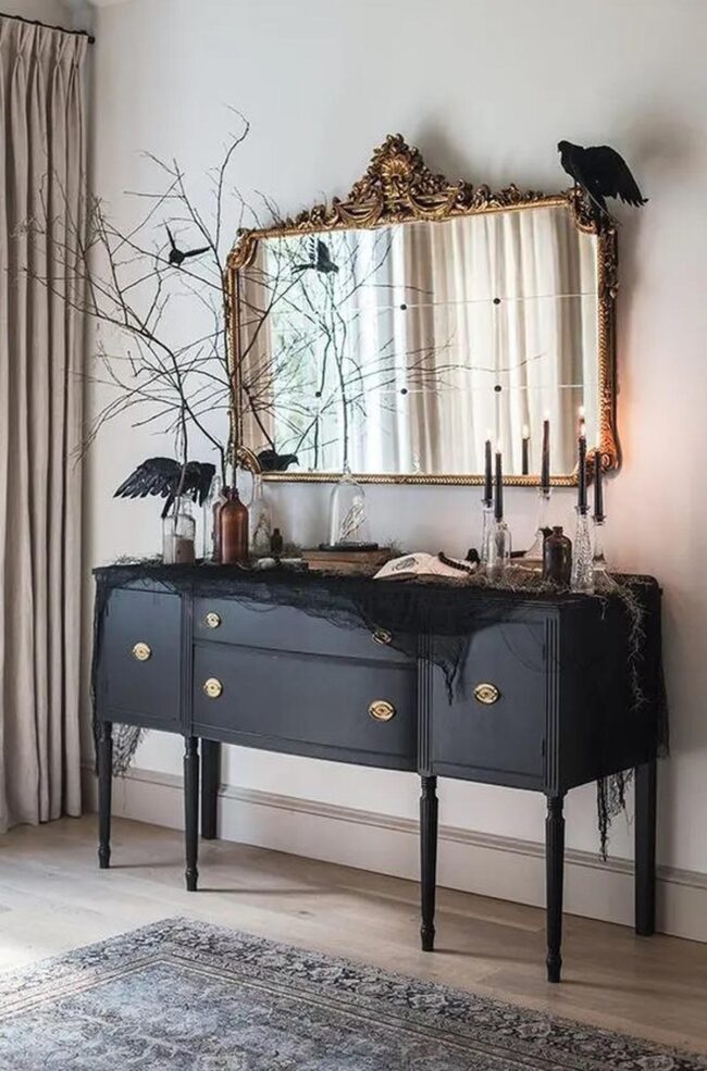 Gold-framed mirrors capturing witchy silhouettes instantly spark magical vibes that draw your eye across mesmerizing Halloween spaces.