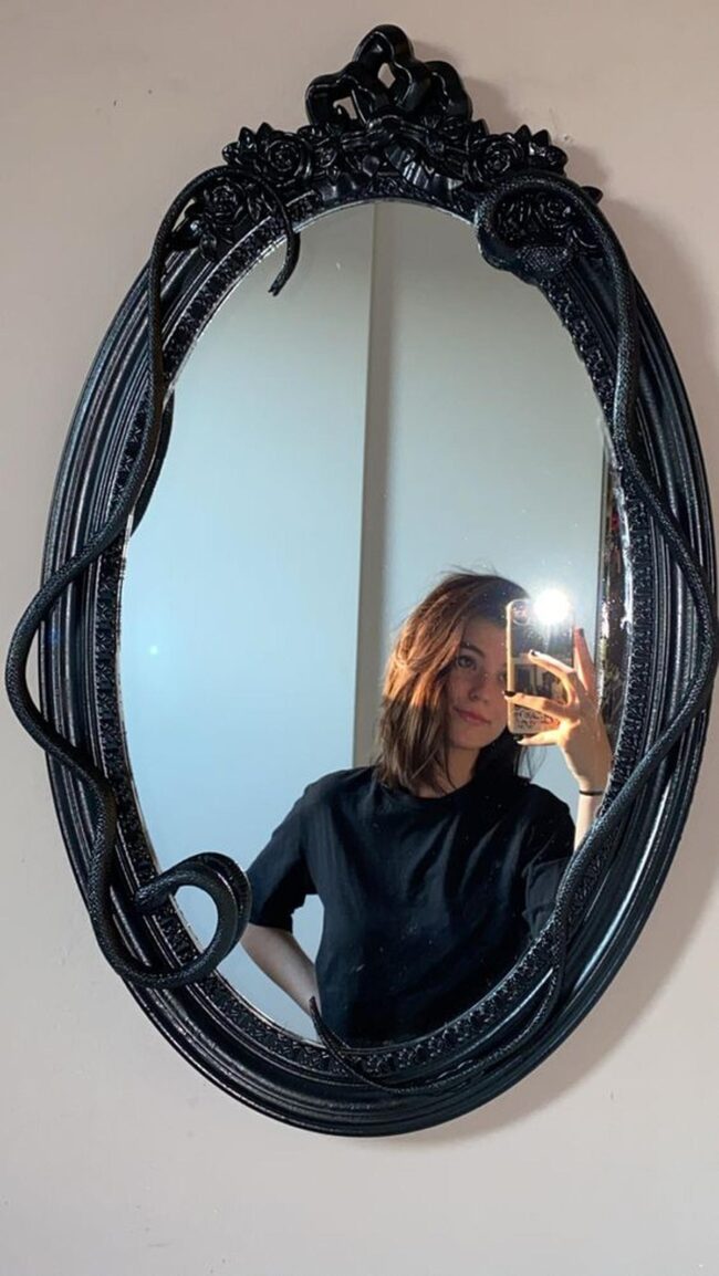 Paper bats cling dramatically to the mirror's frame, weaving visual movement that pulls your gaze across every intricate detail.