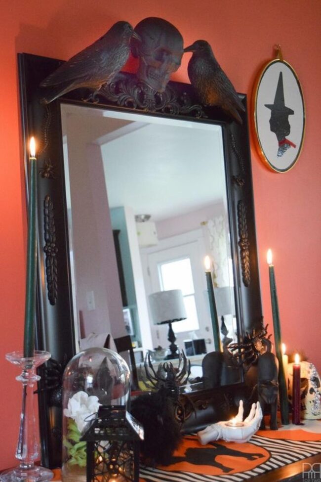 Halloween vibes burst through this spine-tingling setup where dark feathered creatures nestle around a skull-framed mirror, weaving mysterious shadows across the space.