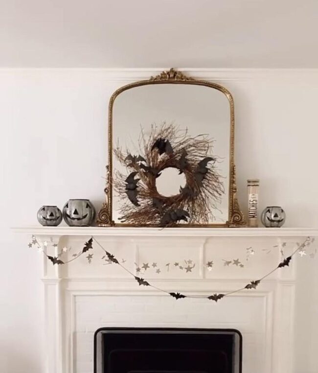 Halloween magic bursts from this enchanting display, where paper bats seem to dance across a scalloped mirror while clever details invite curiosity.